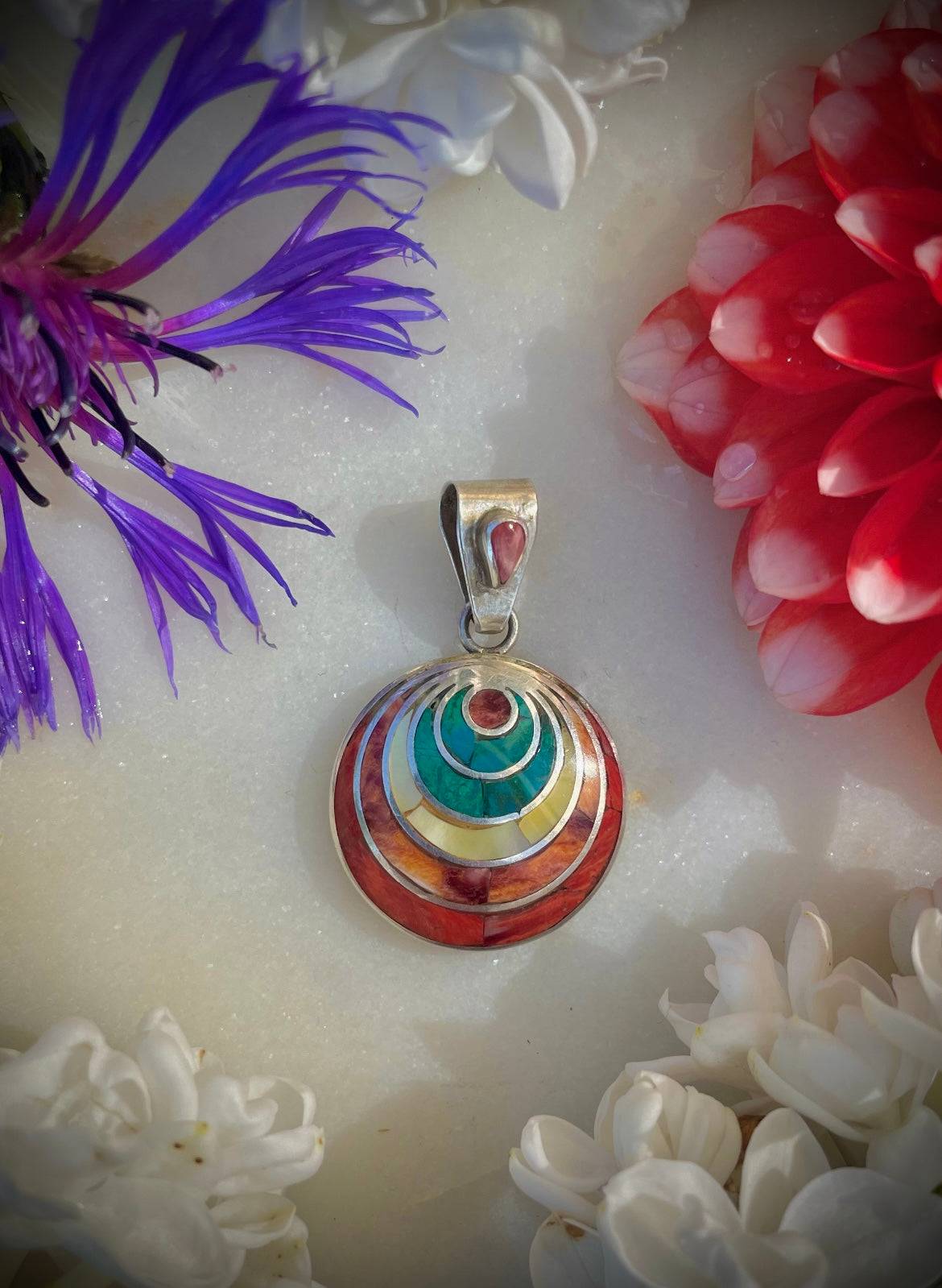 Detta hänge är i 950 sterlingsilver med infattningar av lapis lazuli, krysokolla, pärlemor och spondylus. Det är 2,3 cm i diameter och 3,7 cm inklusive hänge med symbol för regnbågen.